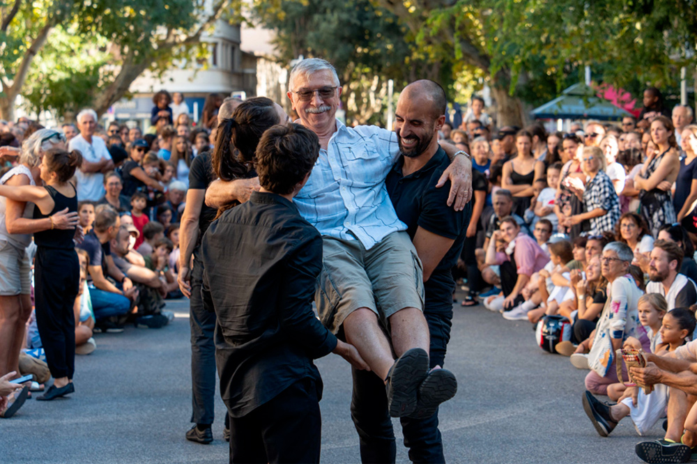Petit à petit, la rumeur s’est propagée à travers le quartier, un message circulait : « Pour retrouver sa jeunesse, il suffit d’en répéter les folies » d’Oscar Wilde. La présence de ces artistes habillé·es en noir, muet·tes, en immersion dans la ville invitait le public à un Grand Rendez-Vous. Le dimanche 14 septembre à 17h, sur la place du marché du Pont-du-Las, le collectif proposait un magnifique spectacle, comme une apothéose de cette semaine passée dans le quartier.