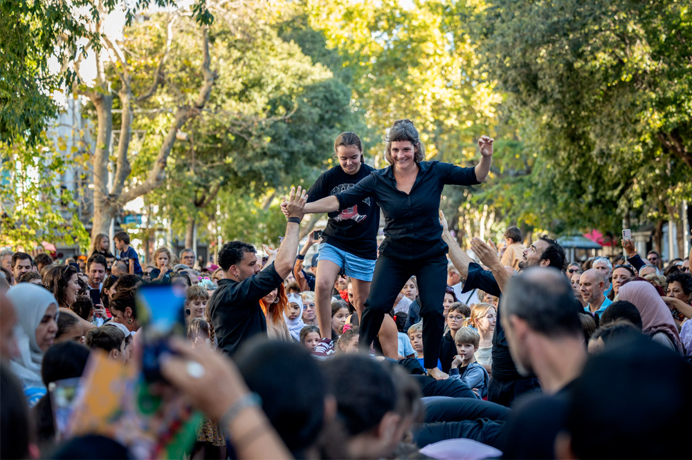 Ce projet a également permis de tisser des liens forts avec nos partenaires : un groupe de jeunes suivi·es par la Ligue Varoise de Prévention a pu rencontrer et suivre les artistes et contribuer à la diffusion de la rumeur. Une association du centre social Toulon-Ouest a organisé un repas pour l’équipe artistique. Des élèves de l’école primaire du Pont du Las ont eu des ateliers d’initiation à l’acrobatie et aux portés. Des élèves du collège Pierre Puget ont participé au spectacle avec une chorale.