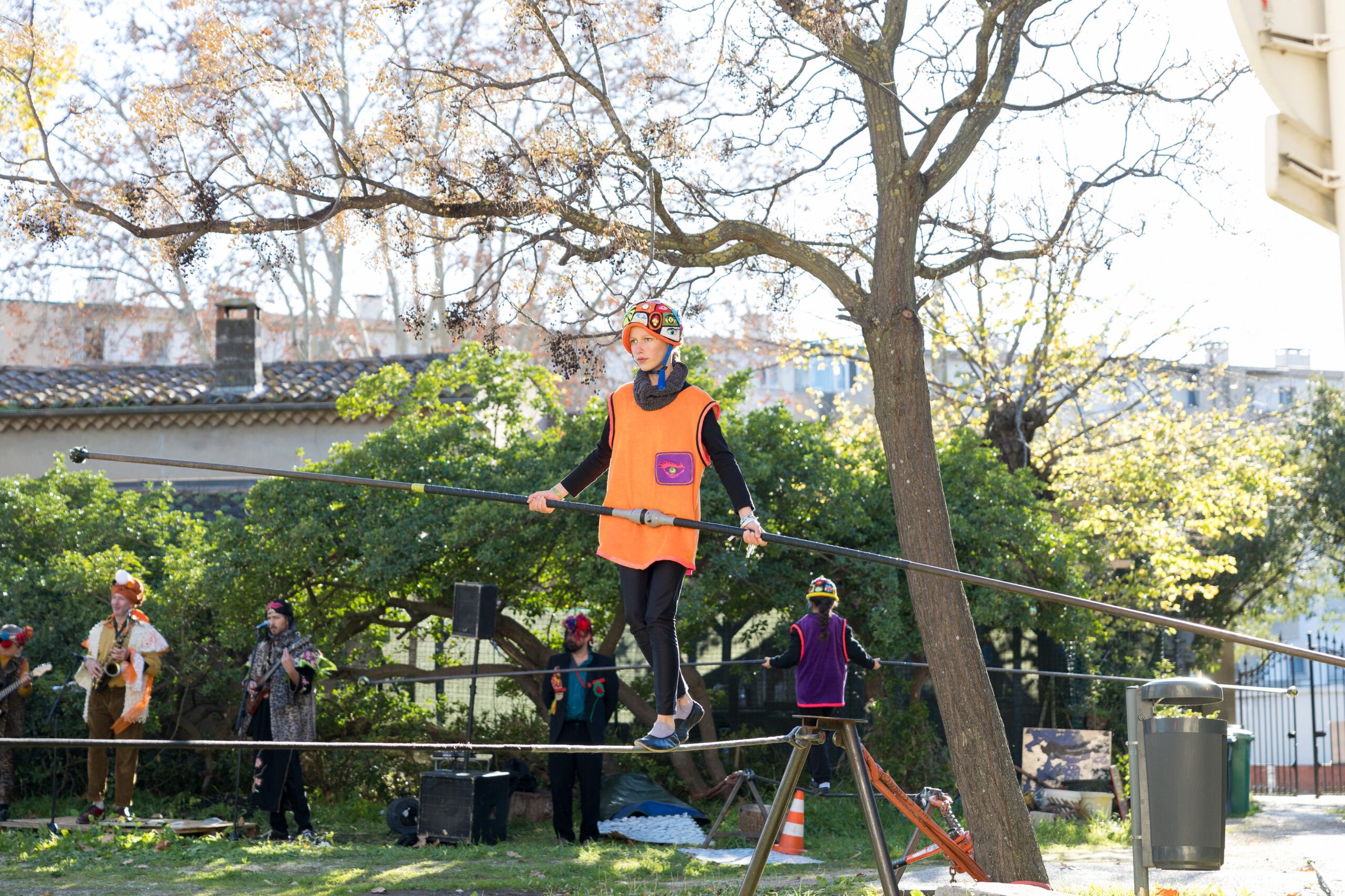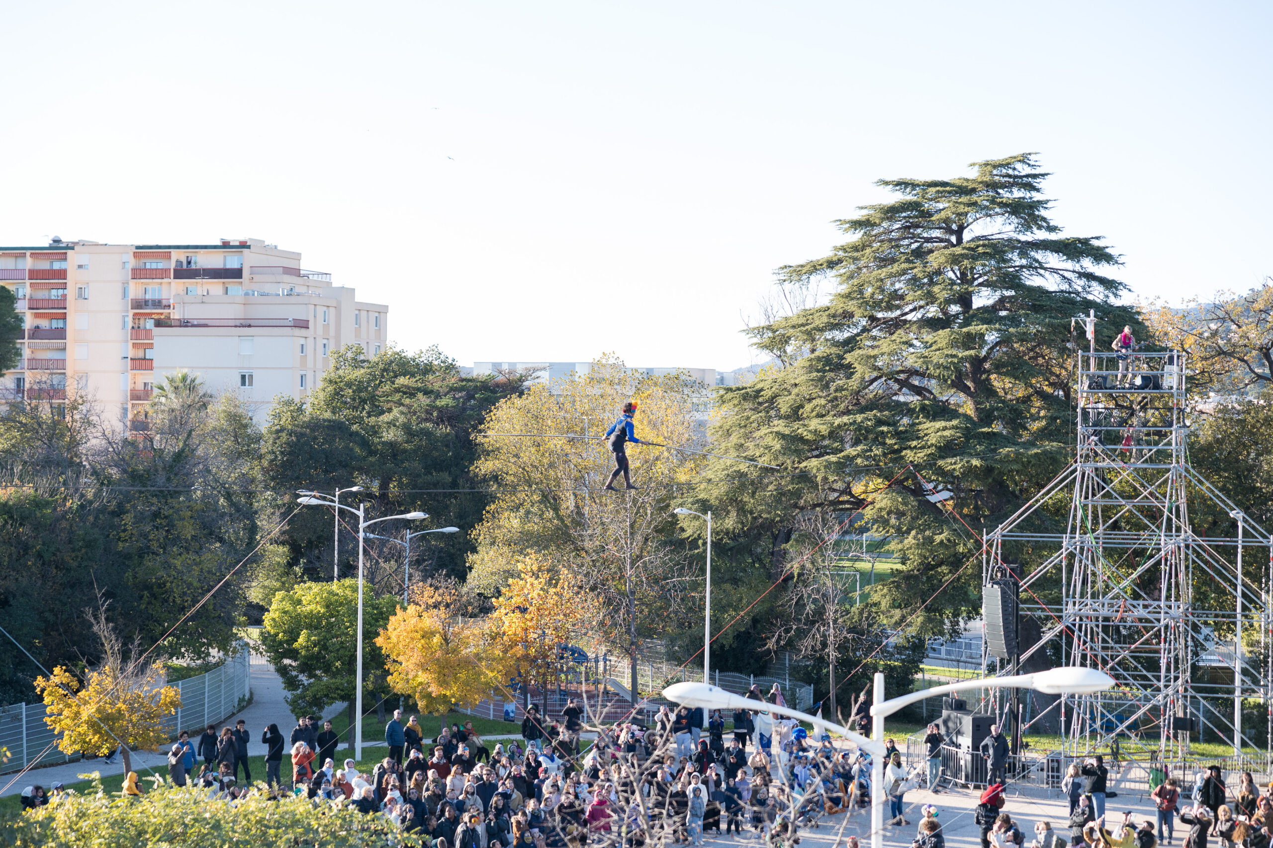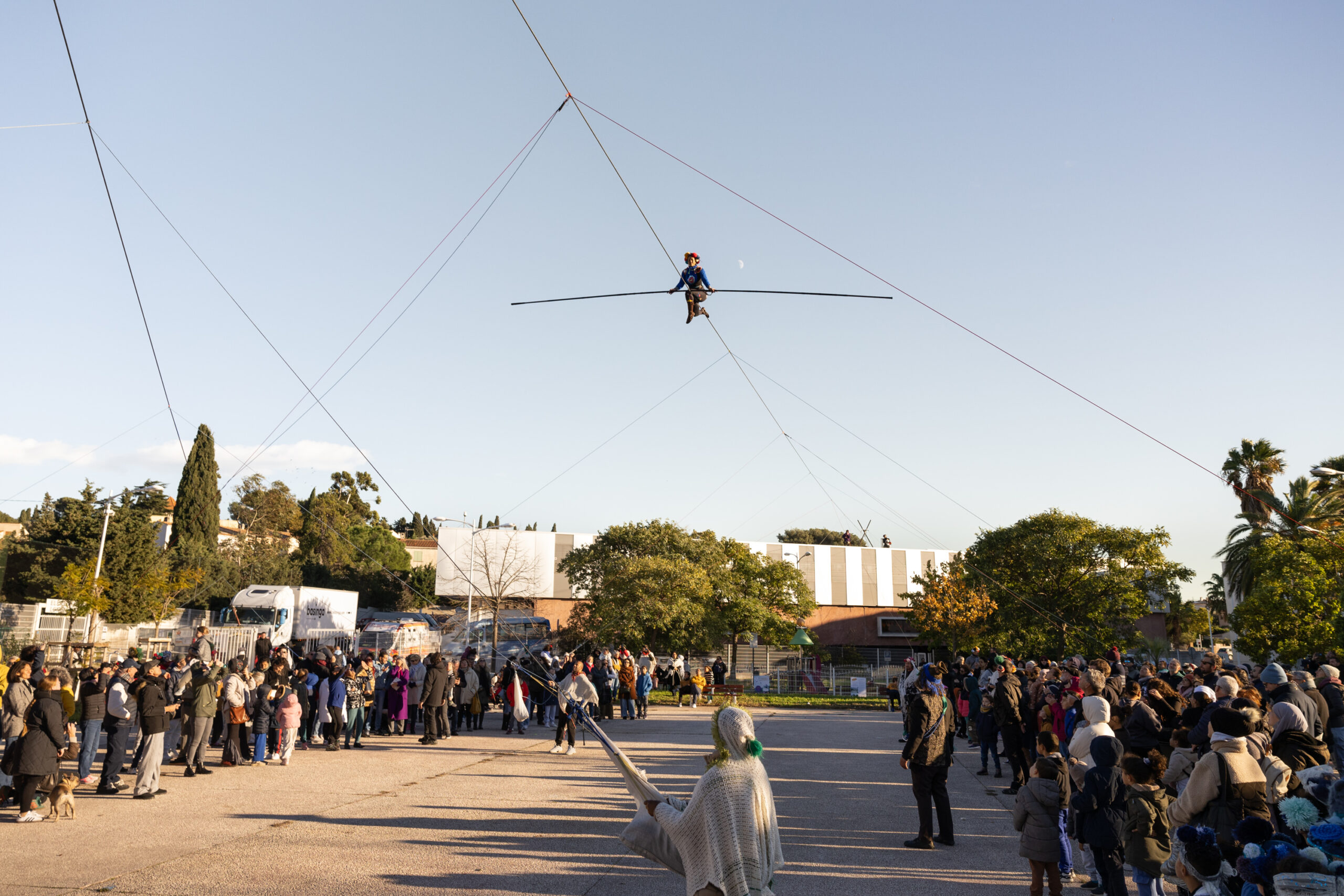 Le point culminant de cette résidence artistique a eu lieu le 8 décembre 2024, avec une traversée impressionnante de Tatiana-Mosio Bongonga sur un fil tendu à plus de 10 mètres de hauteur, sans filet, au-dessus du parc de Sainte-Musse. Cet événement a attiré plusieurs centaines de spectateurs, dont des habitants du quartier, des employés municipaux et des élus, notamment Madame le Maire, Josée Massi. Un moment de grâce, de vertige et d’émotion, qui a marqué la fin d’une première édition riche en rencontres et en créations.