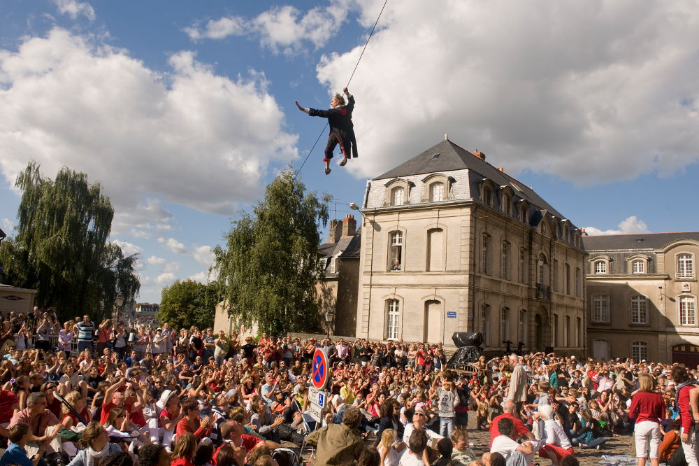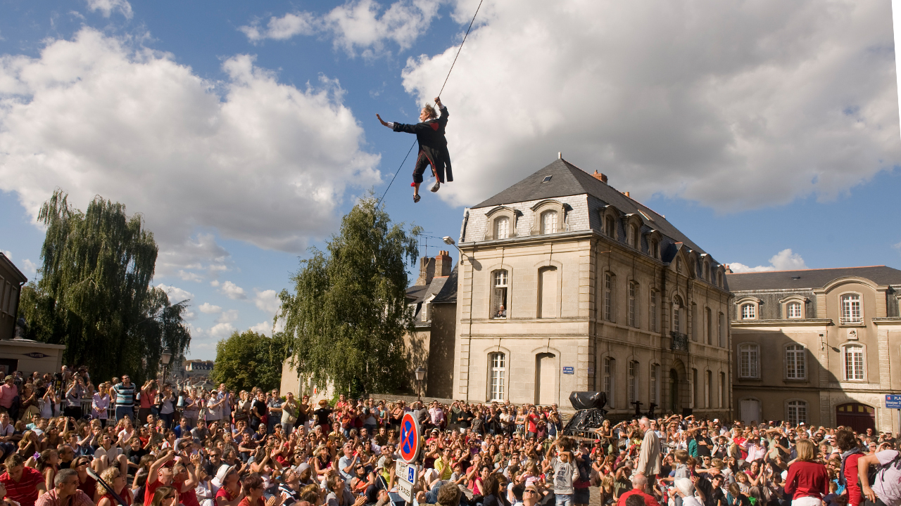 Un folambule dévoile sur les murs et dans l’air une voie poétique, dont le sommet est le public. L’architecture est la partition du danseur de façade et le ciel du danseur aérien. Par sa présence solitaire, il donne l’échelle humaine. C’est un allumeur de rêves. Avec son sifflet, il interpelle et fait sonner la cloche du rassemblement poétique. Dans un corps à corps avec les façades et le vide, il met pacifiquement en jeu sa vie pour en dévoiler la fragilité.