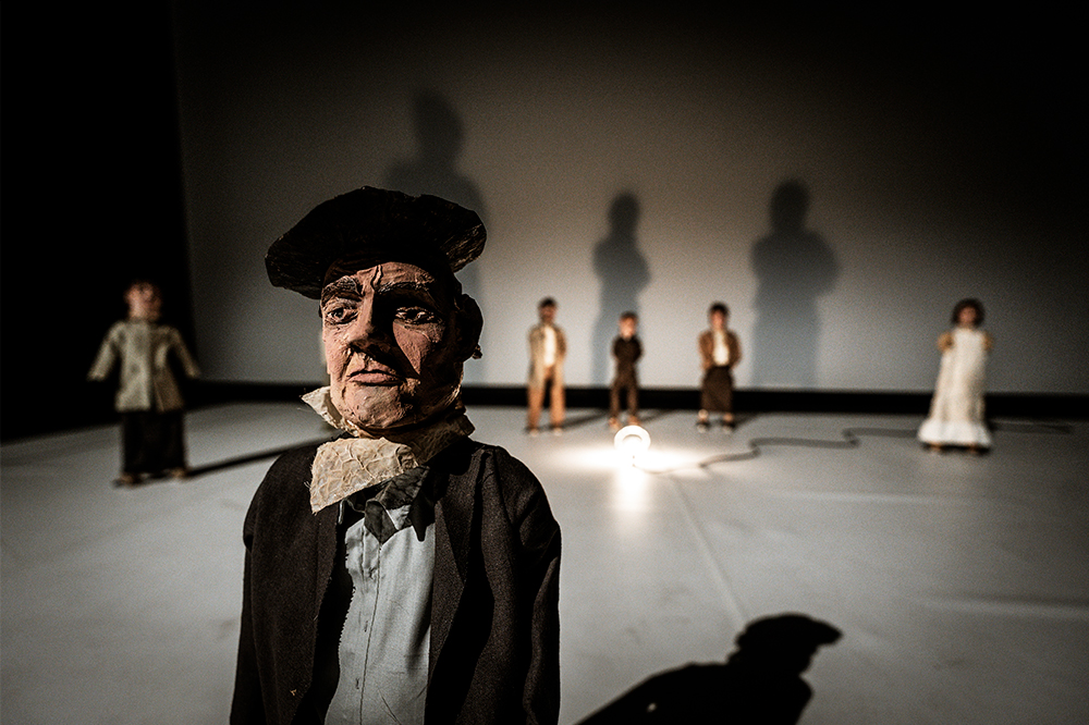 Disposées sur la scène, les marionnettes ne bougent pas. Mais le sol, sous elles, s’affole littéralement. On distingue les images en noir et blanc d’une guerre qui se prépare. Alors commence une sarabande infernale où les événements s’enchaînent avec une précision d’horloger. Joëlle Gayot, Le Monde