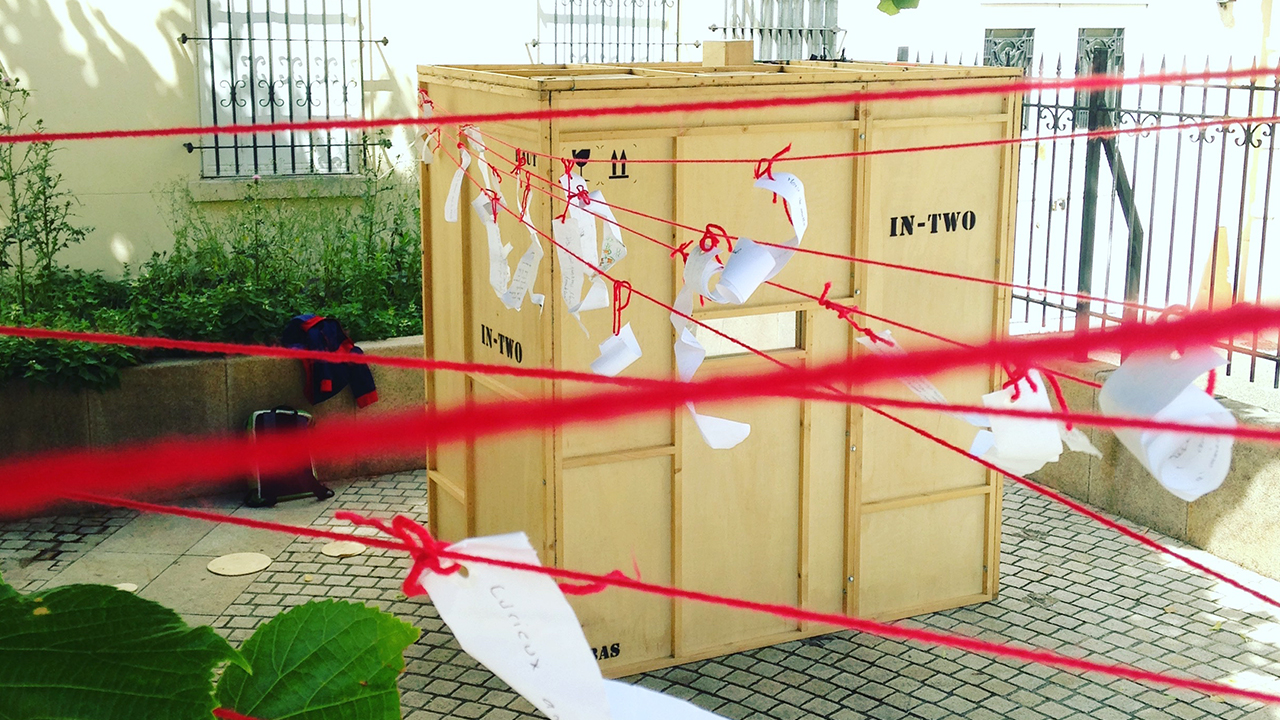 In-Two, c’est une petite collection de trois grandes boîtes aux allures de caisses de transport, installées à Châteauvallon qui invitent le spectateur à entrer pour partager une histoire, une confidence, un (jardin) secret. L’écriture de ces rencontres, entre fiction et réalité, s’est construit au fil des résidences sous forme de commande à des auteurs. Les récits témoignent d’histoires du quotidien, d’histoires d’amour ratées, d’inavouables aveux… Des courtes formes de 6 à 8 minutes, à la manière d’entre-sorts. L’acteur choisit son histoire en fonction du spectateur, rien n’est prémédité. Mais tout est organisé. Chaque acteur dispose de 9 propositions, le hasard se chargeant des heureuses coïncidences. Les 3 boîtes sont identiques à l’extérieur, mais à l’intérieur, l’esthétique, l’ambiance, et le format sont adaptés à l’acteur qui l’habite et à son corpus de textes.