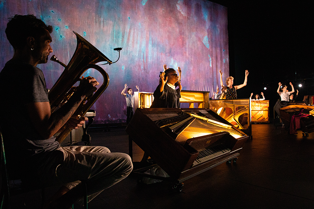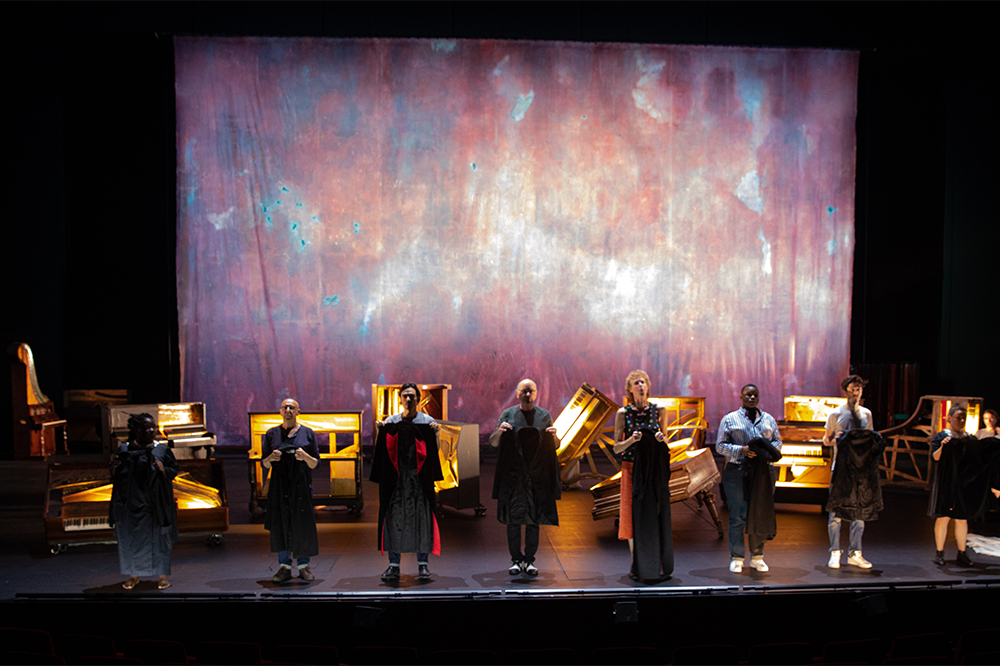 Sur scène, c’est tout un monde de destruction et de chaos, ravagé par le feu. Au-dessus, un pont qu’empruntent conteurs et musiciens, messagers de beauté. Bellorini, Monteverdi, Novarina, ensemble, descendent au fond des ténèbres rechercher Orphée, que guide le dieu Amour. De retour dans l’éclat du soleil, la vie renaît et s’épanouit par la grâce de la musique et du chant.