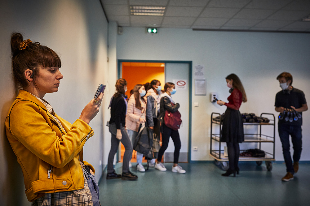 Seule en scène, Juliette Allain interprète Claire. Casque sur les oreilles, le public la suit dans son parcours. À travers ce dispositif sonore, nous entendons tout : ses échanges avec son petit ami et sa gynécologue, ses pensées, ses sensations. Une écoute particulière qui instaure une étonnante proximité avec la comédienne et nous plonge pleinement dans sa prise de décision.