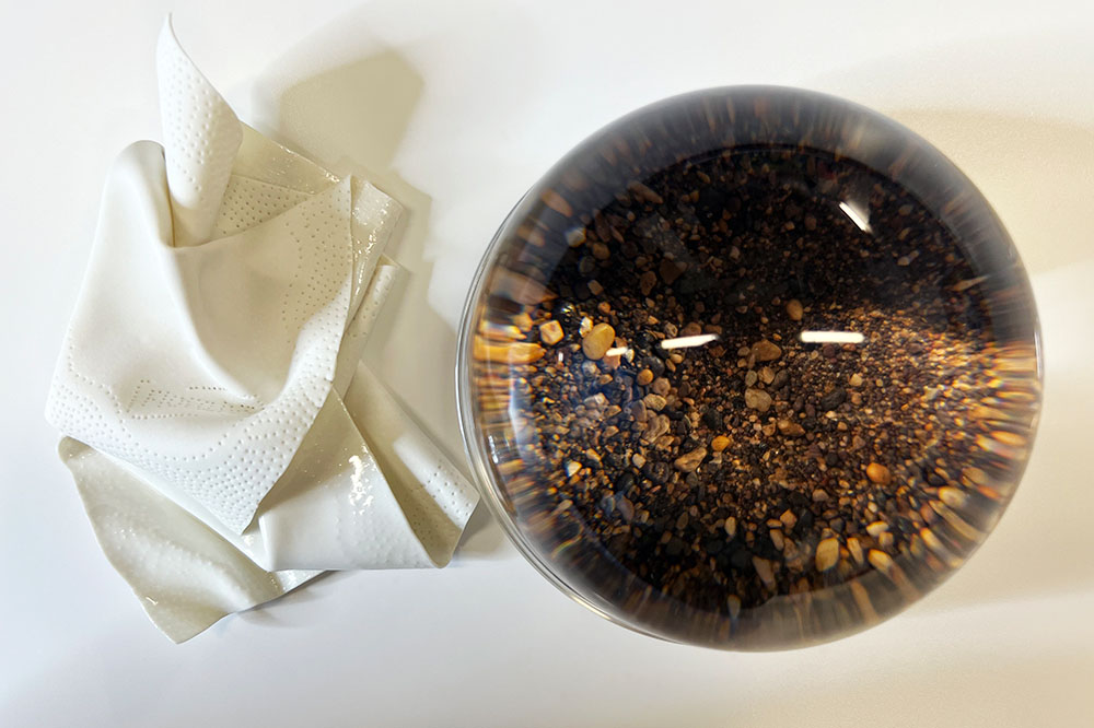 « L’artiste traduit les fluctuations, les formes alternées de la glace, du liquide ou de la vapeur tout en désignant une totalité. La transparence se mesure à celle de la matière où elle se dépose. Le contenant et le contenu se croisent dans un jeu de miroir et la couleur s’y formule comme une simple hypothèse. Tout est saisi avec une précision extrême, dans un geste presque clinique. Rien ne vient perturber une recherche qui s’exerce toujours dans un équilibre fragile, dans un état précaire quand le moindre écart mettrait l’expérience en péril. […] Ces sculptures-objets arborent ainsi les signes, ou plutôt les stigmates d’une mer menacée. Cette eau, il s’agit de la recueillir, de la posséder, comme si à travers elle on s’emparait du monde. La réalité se confronte alors au rêve. Et c’est dans cette interstice que l’œuvre s’élabore. » Michel Gathier, (extrait) 2019
