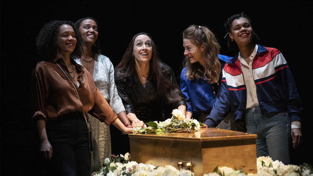 Si Clôture de l’amour s’inscrivait sur une page blanche, Mon absente explore le « versant obscur » et s’écrit sur une page noire. Autour d’un cercueil jonché de fleurs, les personnages naissent de l’ombre, les groupes se font et se défont, un ballet de satellites fugaces s’établit, la parole se lie et se délie, se relie alors que les souvenirs affluent. Et cette parole fait tenir ensemble les vivants après la déflagration de la perte. La pièce est intime aussi bien que collective. On plonge dans l’invisible, au plus profond des cœurs et dans les fins replis du cerveau, dans l’inconscient, le désir, l’inavouable, le manque, aux territoires mouvants du rêve. Le décès est le détonateur, le déclencheur de parole. Du recueillement à la douleur de l’absence, les mots se répercutent dans les corps et dans les âmes. Comme souvent au théâtre, l’absente est convoquée. Et, pour Pascal Rambert, parler, se parler, nous parler, peut consoler, apaiser, pour mieux vivre son présent.