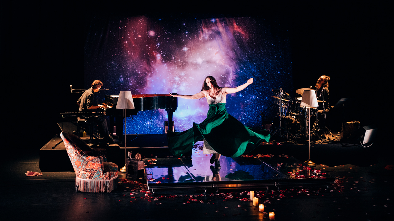 Entourée de Grégoire Letouvet, pianiste, et de Pierre Demange, batteur, elle nous amène au bord de la transe. Profondément ancrée en elle depuis toujours, la chanson est l’autre langage de prédilection d’Estelle Meyer. Sans s’inscrire dans aucun courant, loin de toute filiation ou « école », l’auteure-compositrice-interprète explore dans le mariage organique des mots, de la musique et du chant une esthétique et une vision de l’humanité qui n’appartiennent qu’à elle, à la fois inventrice et géomètre de ses propres territoires poétiques et musicaux. Baroques, sur le  fil, percussives et toujours signifiantes, ses chansons ne se réfèrent en effet à rien de déjà entendu, ni de déjà vu, car la chanson selon Estelle Meyer est également visuelle et, avant tout, le moyen de faire vivre une expérience inédite au public – la comédienne émérite rejoignant alors la chanteuse affranchie et singulière qu’elle a choisi d’être.