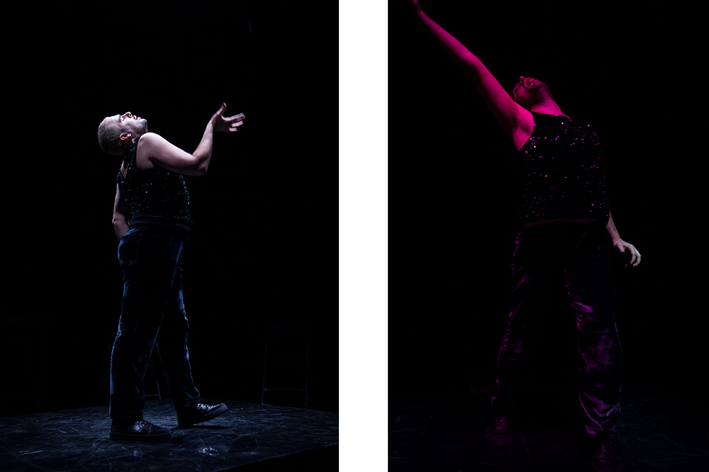 Le public est disposé autour de l’aire de jeu. Le musicien joue en direct et le régisseur son est lui aussi à vue. Dans cette proximité, nous sommes conviés à la vibration intime d’un corps, celui d’Arthur Perole en solo, d’accélérations en ralentissements, de retours rapides en fulgurances, de moments d’interrogations à d’autres où la sensualité l’emporte. Par instants, des bugs nourrissent la pièce d’humour et de poésie. Dans cet entrelacement, différents états du corps comme autant de facettes d’une identité qui ne se ferme pas, bien au contraire, mais s’ouvre à la fantaisie. Le costume s’inspire de l’art cinétique qui joue avec la couleur et la lumière et déplace nos perceptions. La musique de Marcos Vivaldi jouée en direct nous entraîne aux territoires de l’italo-disco, des chansons d’amour, du new beat, à des compositions répétitives et même à des interviews… Romantisme, besoin d’amour, incertitudes, tendresse, peurs, rêves, c’est toute notre humanité exaltée.