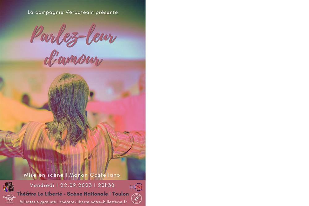 « Parlez-leur d’amour » c’est ce que Émilie, Nicky, et tous les autres, nous ont suggéré au travers de leurs témoignages. Par le biais d’ateliers d’écriture, la compagnie Verbateam a donné la parole au public LGBTQIA+ du Var. Homosexualité et identité de genre, chacun a pu exprimer ses ressentis, ses souvenirs, ses expériences. En allant au-delà des problématiques habituelles pour finalement revenir sur le même et unique moteur qui unit le monde, l’amour. Libération de la parole de personnes qui souffrent encore de préjugés, mais qui acceptent de se dévoiler, de nous livrer cette part d’intimité et qui demandent au monde de les écouter. En battant les cartes du genre et des sentiments, cette pièce délivre un message d’universalité. Qui sommes-nous ? Qui sont-illes ? Plus inclusif que jamais, et en même temps tellement commun. Voyage intimiste, drôle, sincère et émouvant, mais jamais voyeuriste, mis en scène par Manon Castellano et porté par les acteurs amateurs de la compagnie Verbateam.