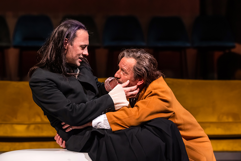 Dans cette grande comédie, tous les ingrédients d’un scénario de roman noir sont là autour d’un machiavélique faux dévot : spoliation, chantage, espionnage, fuite et arrestation. De suspense en rebondissements, l’intrigue audacieuse de Molière, écrite dans un style où s’entendent parmi les plus beaux vers de la langue française, nous tient en haleine. Macha Makeïeff « interroge le mystère masculin et les lieux de la sincérité du séducteur, du prédateur. Don Juan n’est jamais loin, le menteur, l’homme insatiable, au bord du gouffre ». Mais aussi lui importent les réponses émancipatrices des femmes face à l’emprise, la contrainte sociale et ses impasses. La force d’un conte, domination, expérimentation, désir, une parabole qui vire au cauchemar. Péché, plaisir, infamie, vertige, qu’est-ce qui se joue et où est la vérité ? « Couvrez ce sein, que je ne saurais voir » dit Tartuffe ; l’acteur virtuose qui avance masqué est démasqué par la représentation.