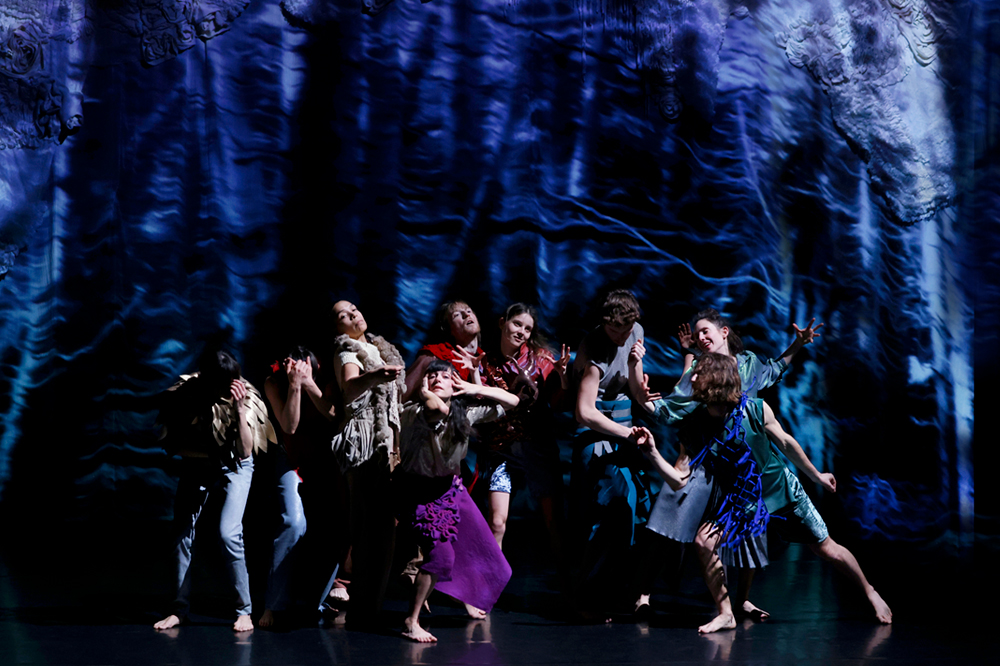 Sur un « plateau-forêt » à la végétation lumineuse et entrainés par la composition musicale originale aux chants et pulsations battantes, les mouvements perpétuels des 10 danseurs se déploient à un tissage de gestes permettant de faire liens entre des différents mondes, sensibles et rationnels, poétiques et signifiants. Devenus rituels chorégraphiques, les motifs évolutifs émergent et s’évanouissent, au fur et à mesure de la pièce, inscrivant les danses dans la mémoire des corps, comme le cycle des saisons laisse sur l’arbre les signes du passage du temps. L’émergence et la répétition de ces gestes qui s’entrelacent et se mêlent, donnent ainsi naissance à un folklore singulier : une fabrication collective unique, portée par une pratique scénique partagée, travaillant un certain corps, habité et façonné par ces mouvements incessants. Ce développement intense et complexe permet d’activer une empathie cinétique entre les corps des interprètes et le public.