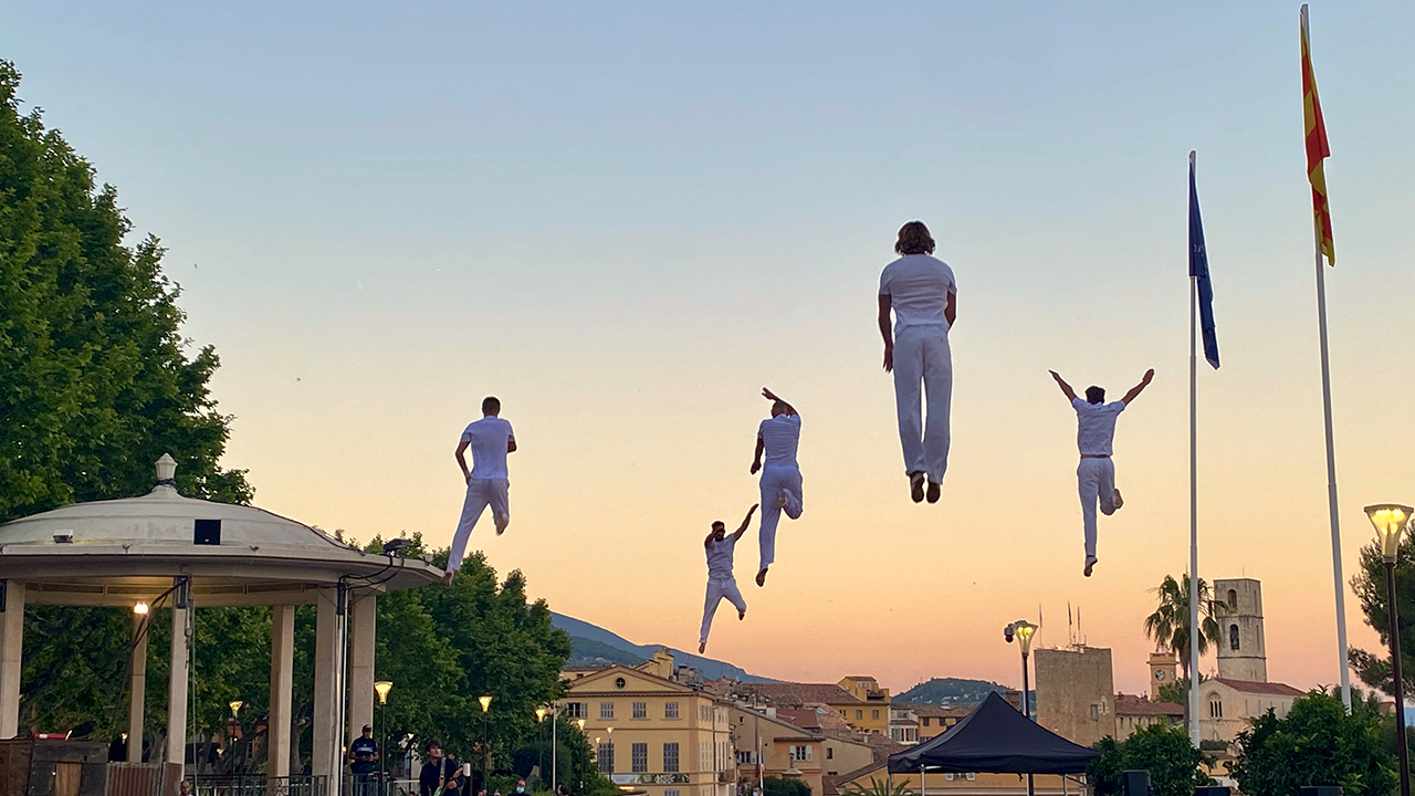 La place de la Liberté devient un terrain d’expression acrobatique et poétique. Une scénographie hors norme avec six trampolines aux hauteurs et dimensions différentes imaginée en trois jours in situ et en public avec des athlètes, artistes et musiciens.